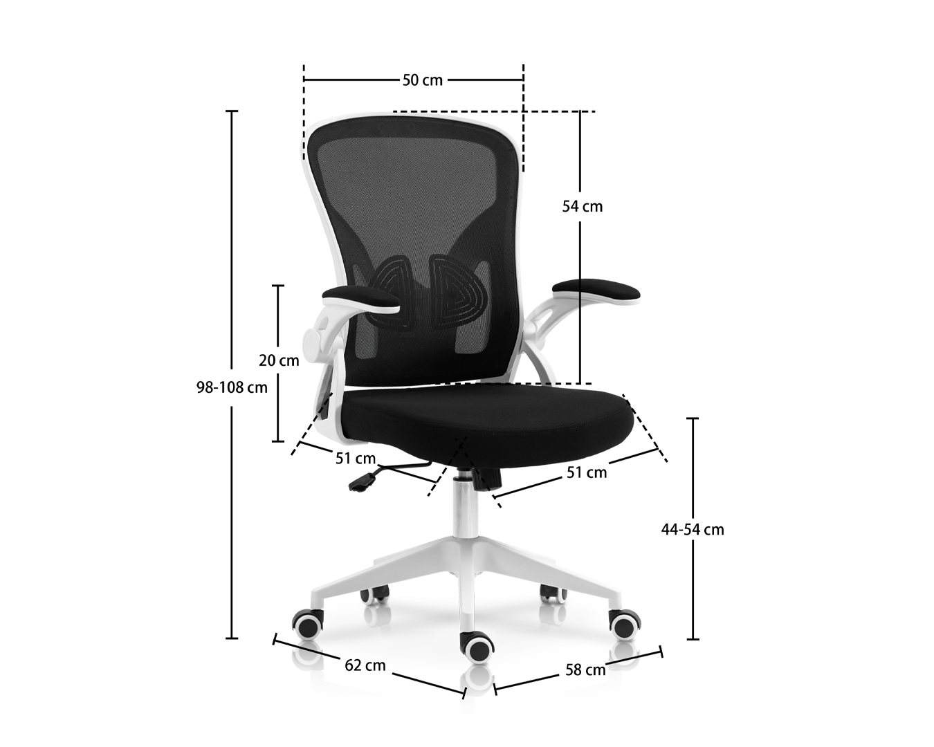 • 검은 색 메쉬 등받이와 시트가있는 매끄럽고 현대적인 디자인이 있으며 흰색 팔걸이와 5 포인트 바퀴 달린베이스로 보완됩니다. 메쉬 소재는 의자의 세련된 외관에 추가 할뿐만 아니라 뛰어난 통기성을 제공하여 하루 종일 시원하고 편안하게 유지할 수 있도록합니다.